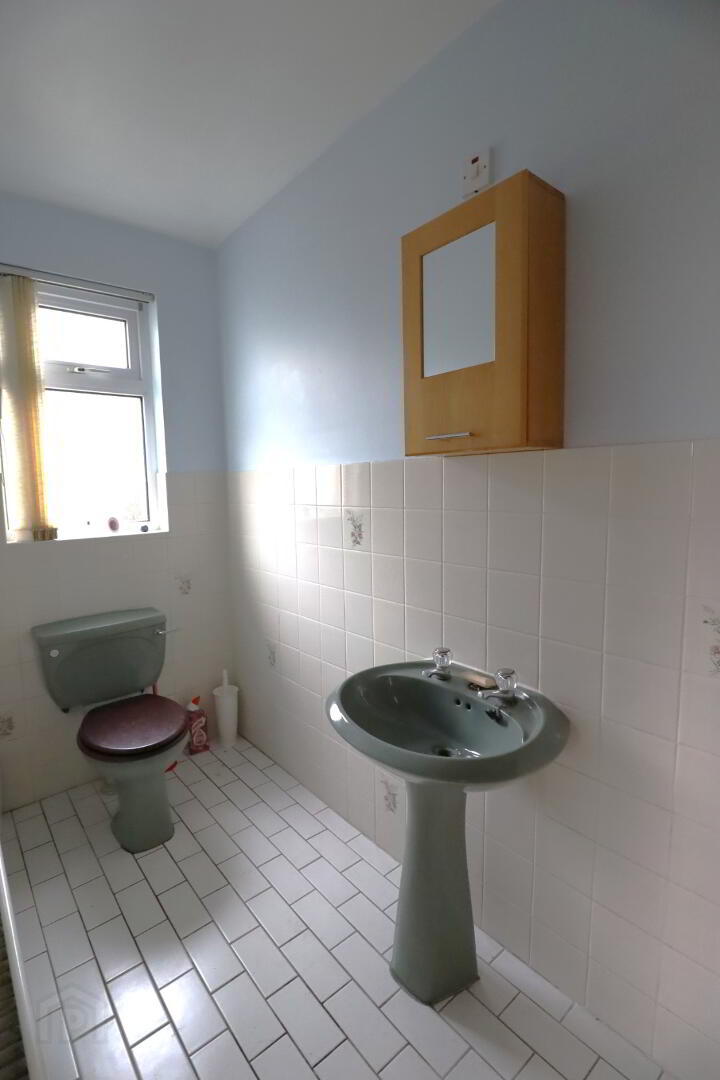 Side aspect privacy window. w/c, pedestal wash hand basin. Tiled flooring and partly tiled walls. Single radiator.