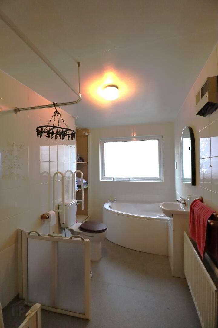 Side aspect privacy window. Corner bath. Level access shower/  electric. W/C. Vanity unit. Double radiator. Shaver point. Linen shelving.