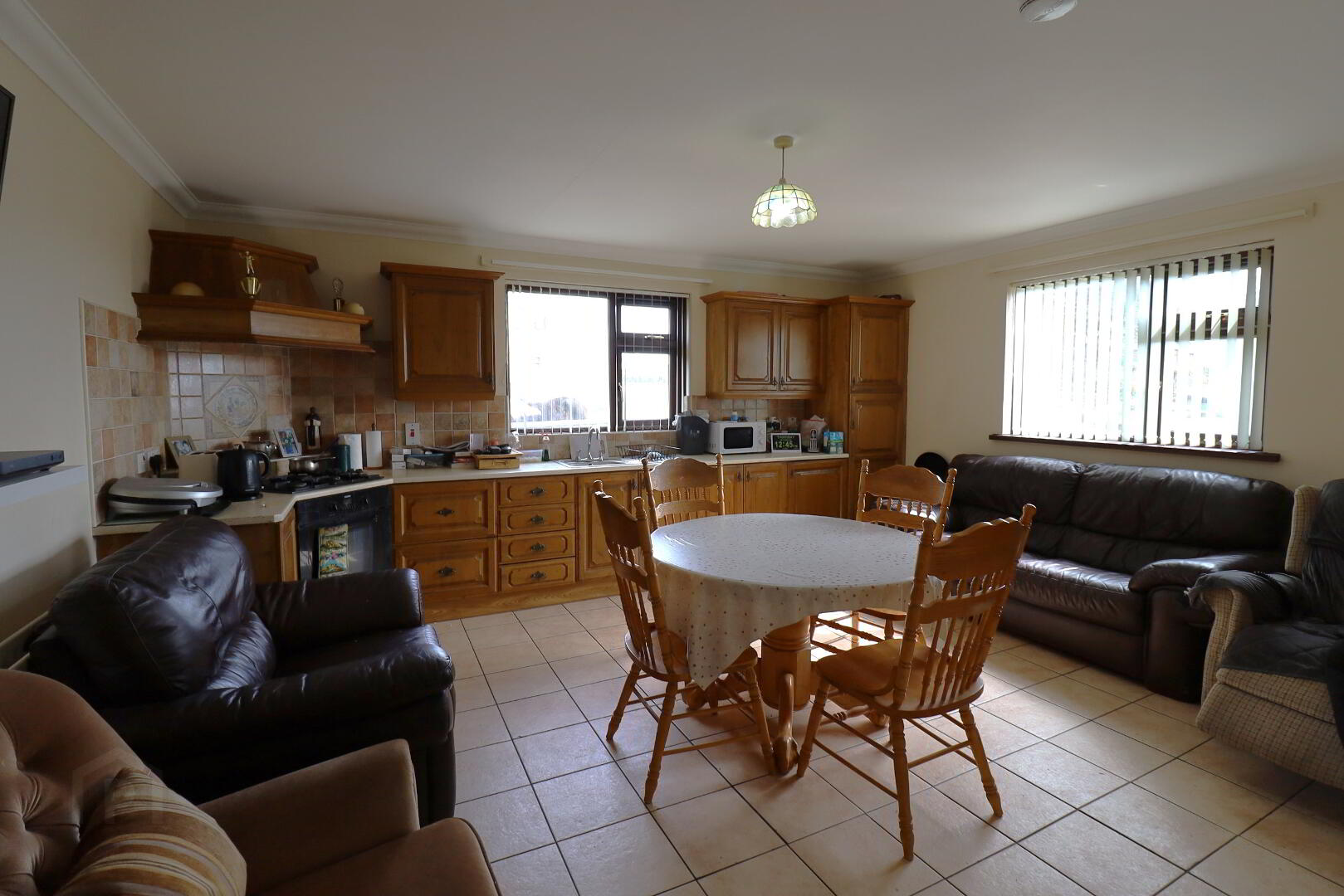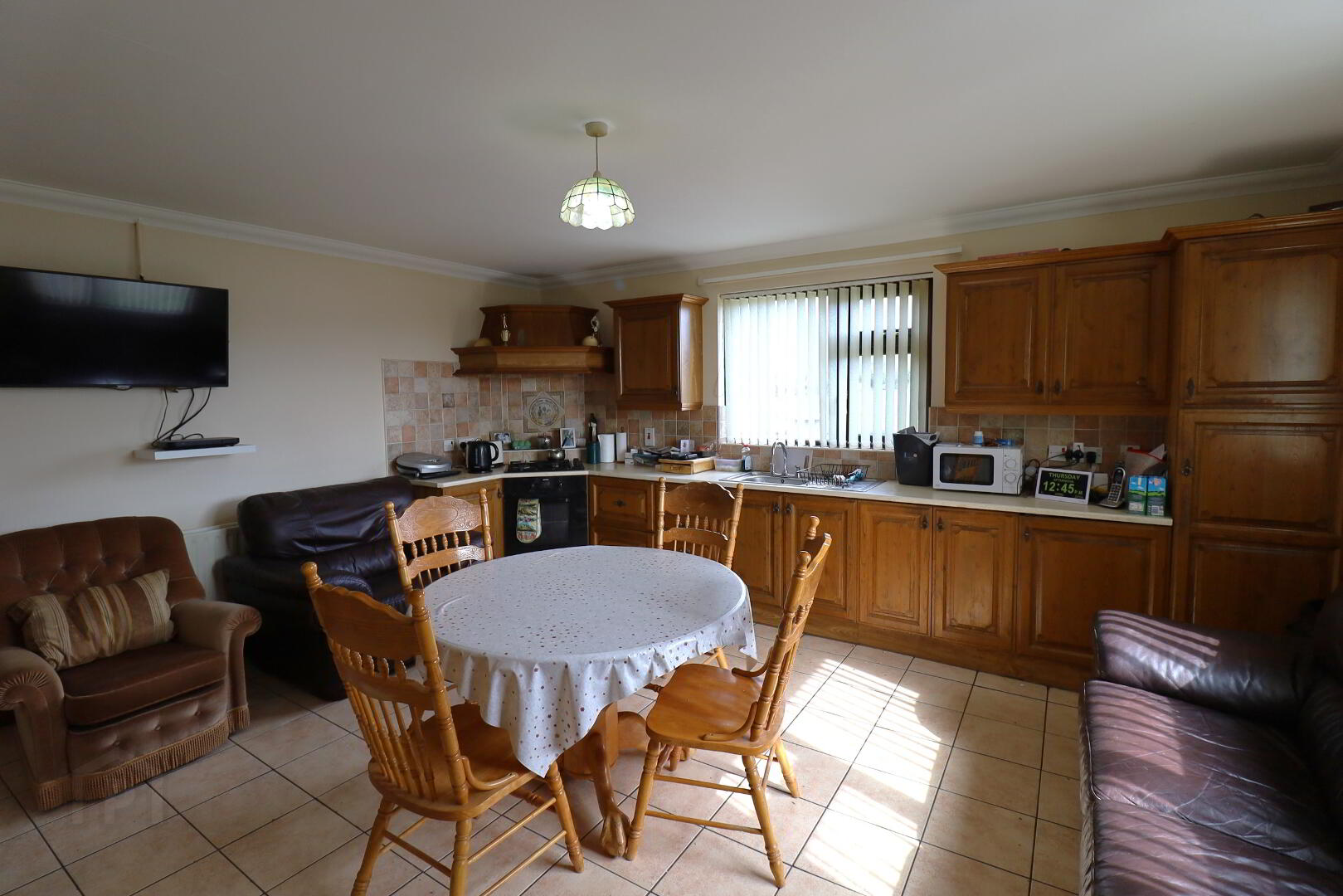 Solid wood kitchen with a good range of high and low level fitted units. Electric oven, four ring gas hob with extractor fan. Tiled floor. Double radiator. Ceiling coving. Under counter integrated fridge. Double power points. Tv point.