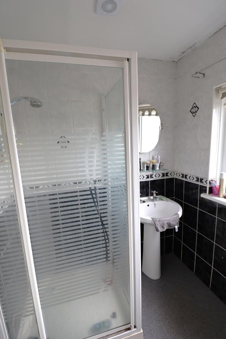 Rear aspect privacy window. Corner shower enclosure/  electric. W/C. pedestal wash hand basin. Single radiator. Tiled walls. Vinyl flooring. Extractor fan.