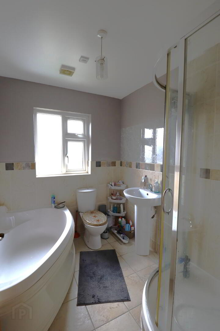 Rear aspect privacy window. Corner bath. Corner  shower with enclosure . Low flush W/C. Pedestal wash hand basin. Single radiator. Extractor fan. Tiled flooring and partly tiled walls.