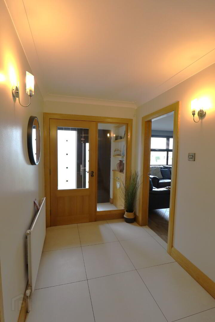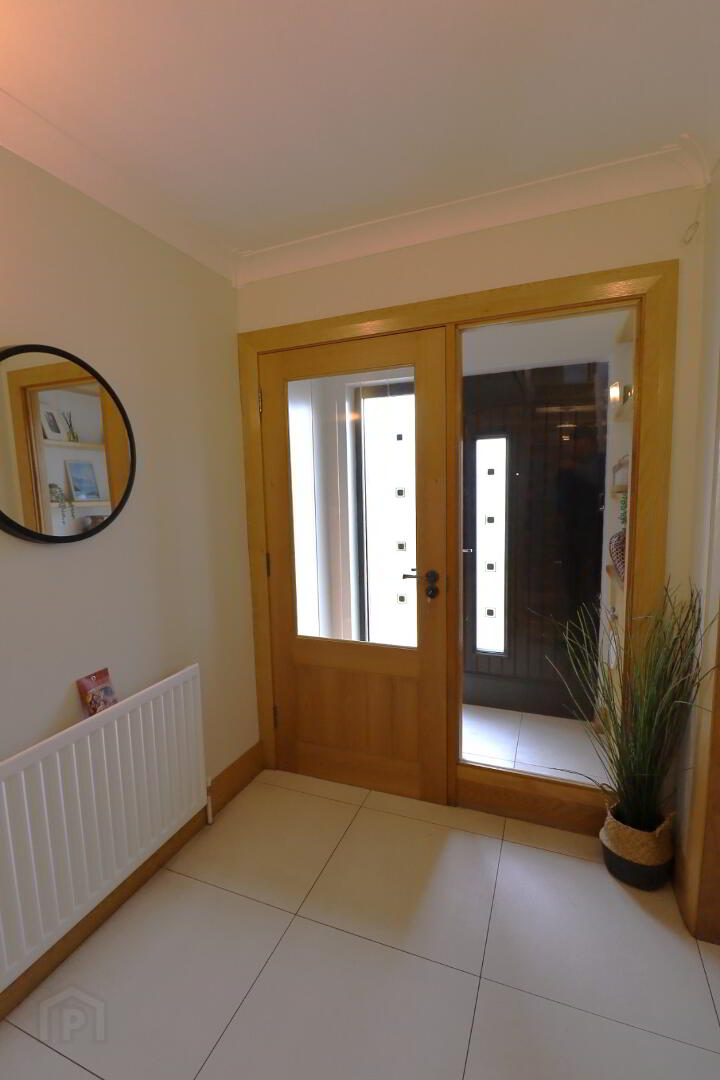 Composite front door with side lights. Meter board. Glazed door with sides. Tiled floor through to hallway.