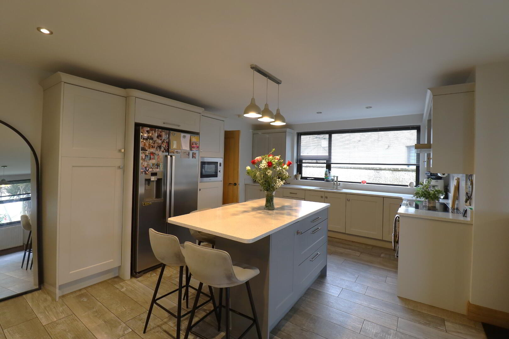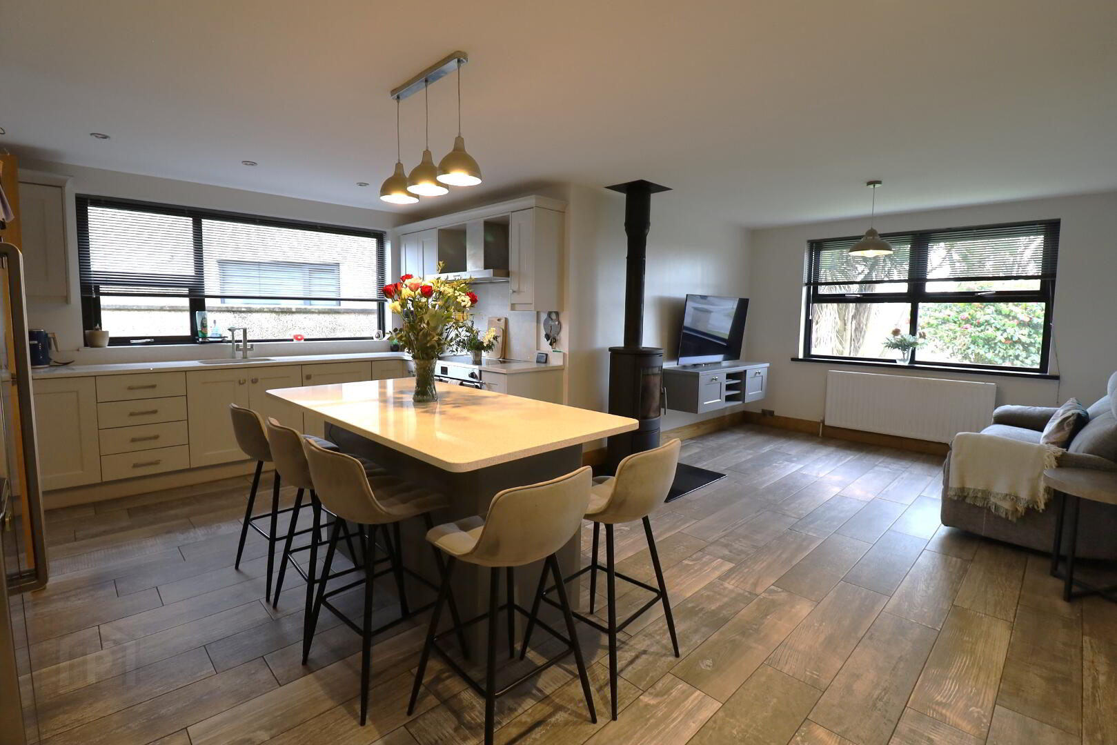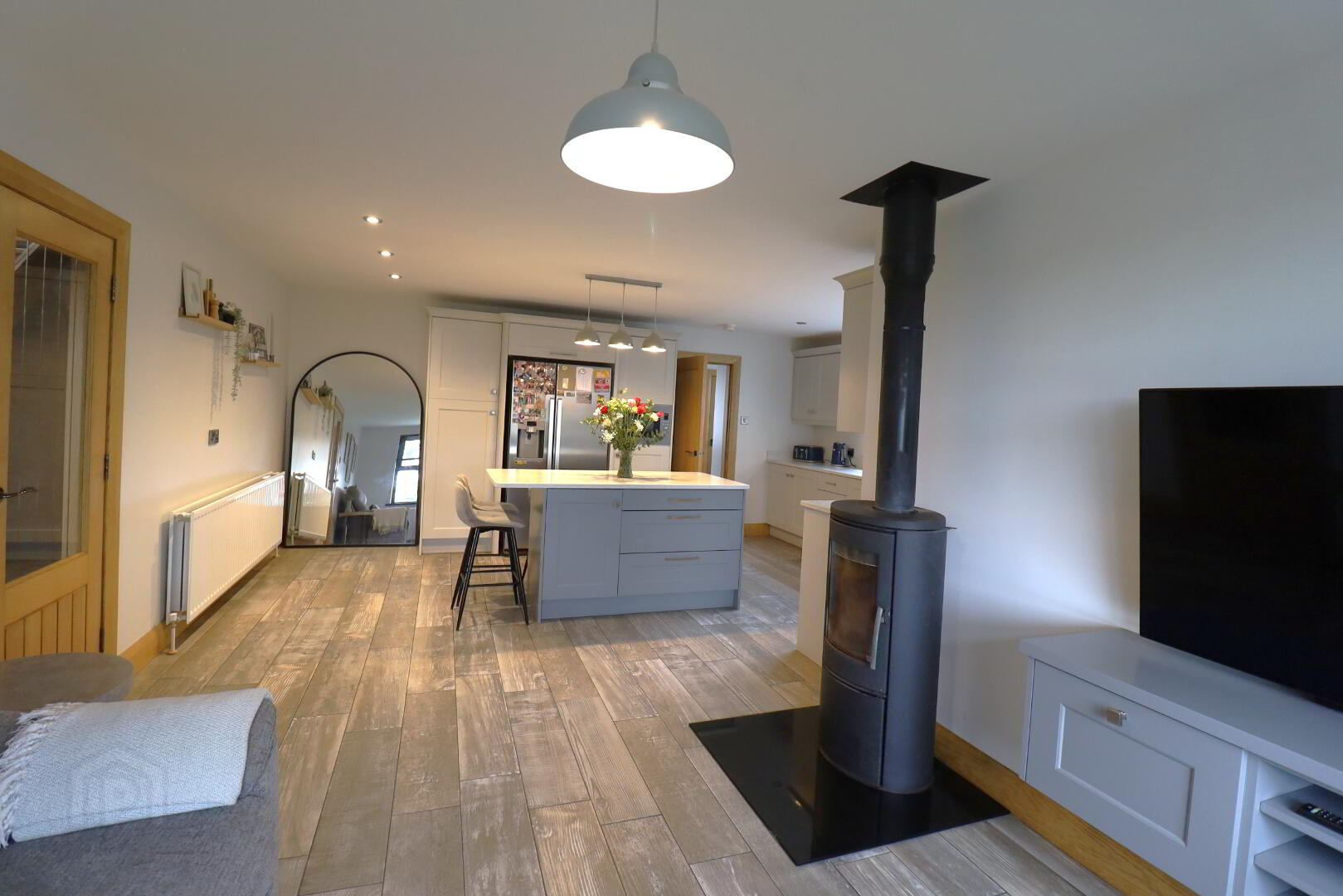 Contemporary fitted kitchen with a good range of high- and low-level units and centre island with seating area. Quartz  worktop and upstand, recessed drainer, stainless steel sink over rear aspect window. Electric range cooker, 5 ring, 2 ovens and grill. Stainless steel extractor fan. Integrated microwave. American fridge/freezer. Tiled flooring. Double power points. Spot lighting. Two double radiators. Wood buring stove with granite hearth.
