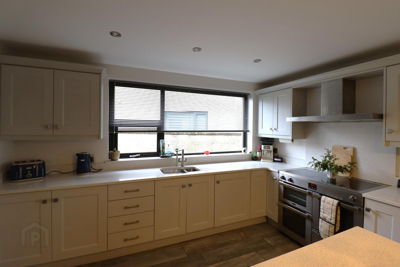 Fitted units. Stainless steel sink with drainer over side aspect window. Tiled flooring. Spot lighting. Plumbed for washing machine and tumble dryer. Double  power points. Single radiator.