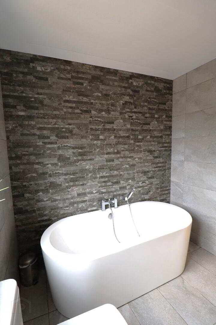 Rear aspect privacy window. Fully tiled. White W/C and bath. Corner shower enclosure, power shower. Vanity unit with mirror. Heated towel radiator.