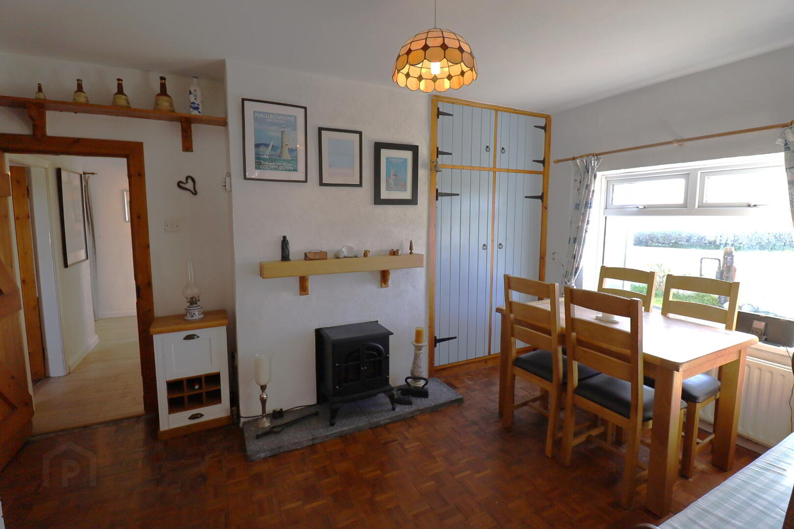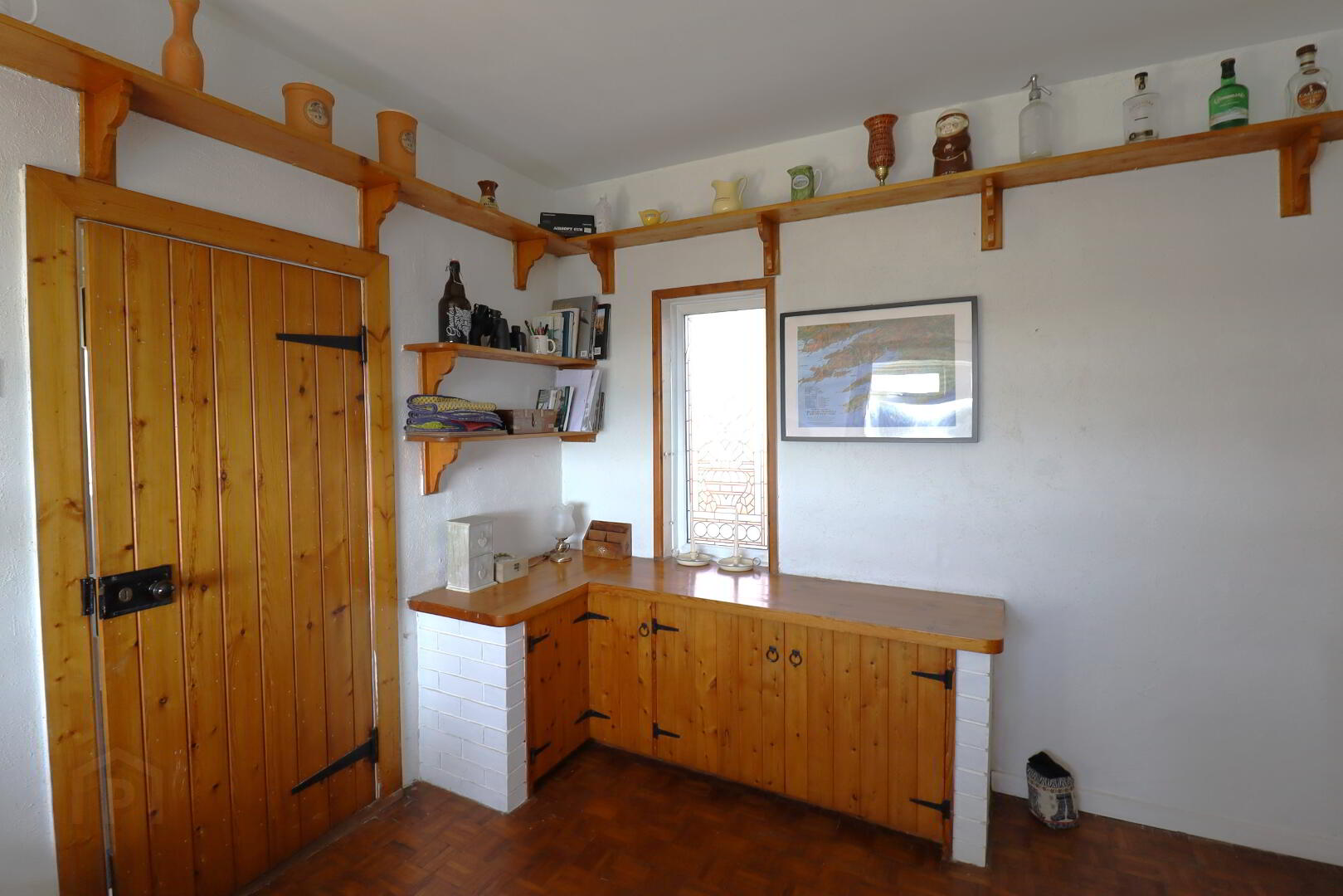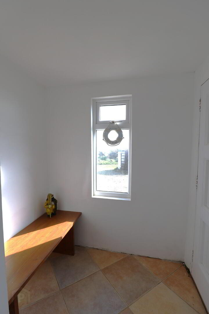 Side aspect window with sea view. Fitted cupboards with bench top. Display shelving. Electric fire insert, feature beam mantle. Double door hot-press with hot water storage tank and shelving. Double radiator. Power points. Parquet flooring.