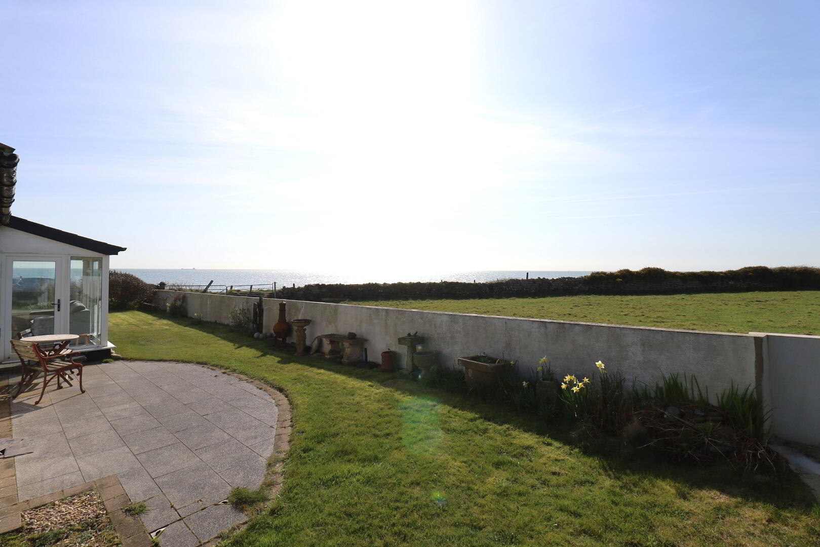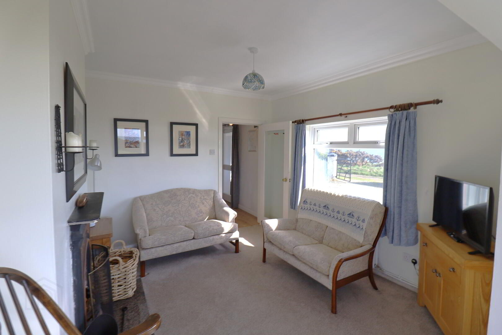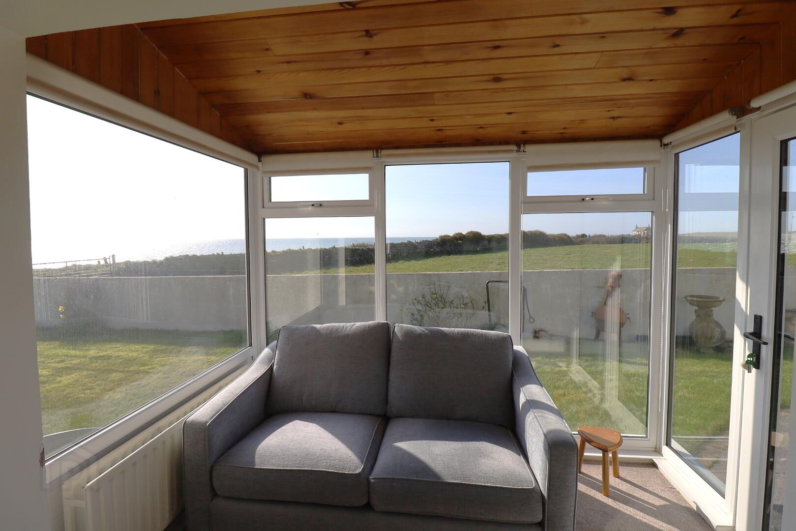 Front aspect window with sea view. Laminate flooring. Cast iron fireplace and polished granite hearth. 2x double radiators. Double Power and single power points. Ceiling coving. Tv point. Carpet flooring. Sunroom with wrap around glazing with sea view and door.