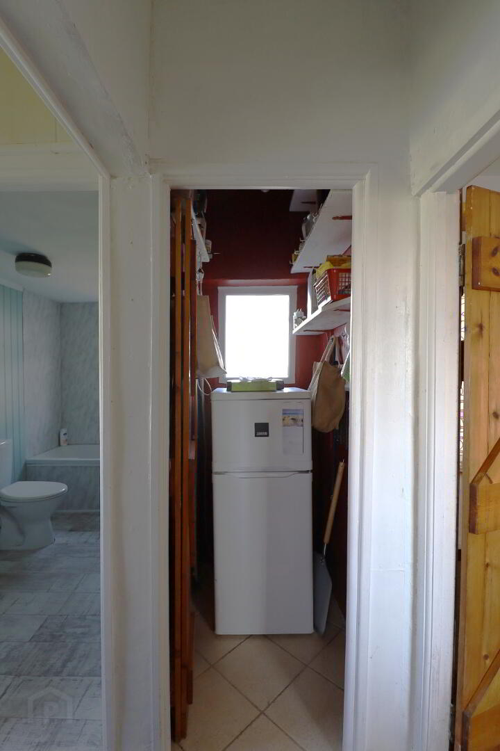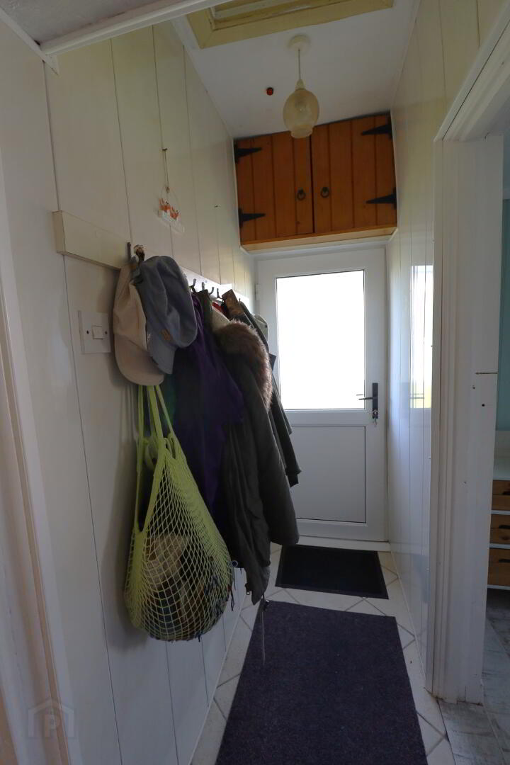 Pvc door to garden. Tiled flooring. Meter board. Coat rail. Pantry area with fridge and shelving.