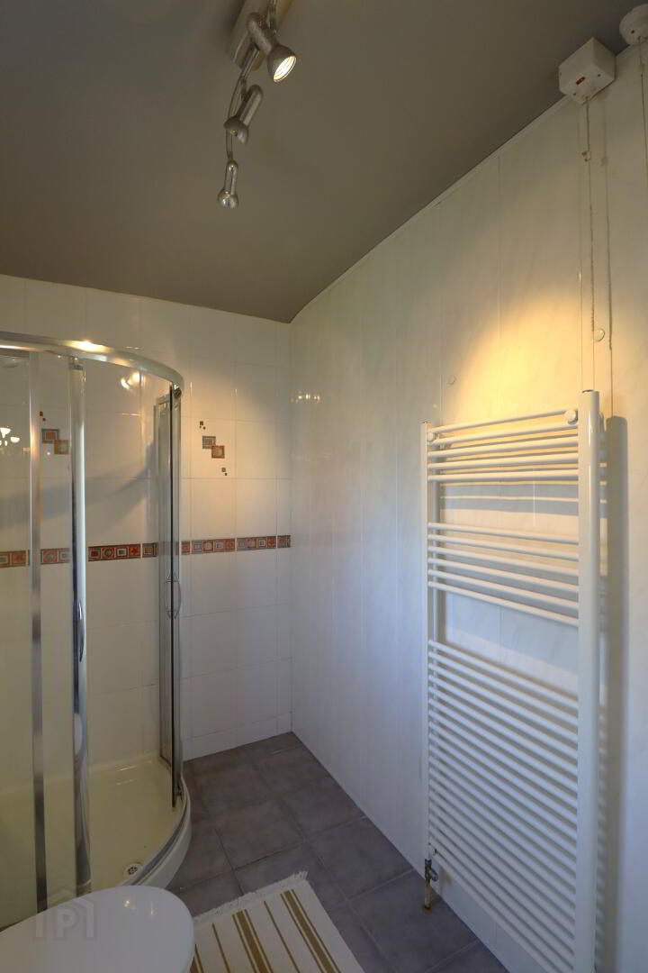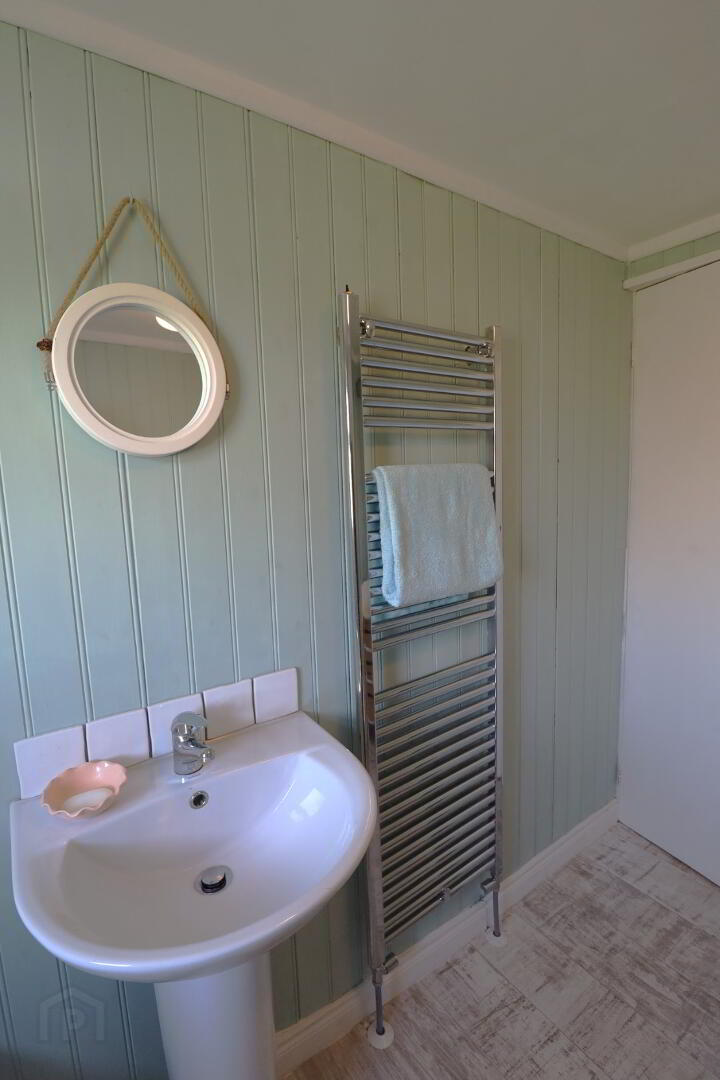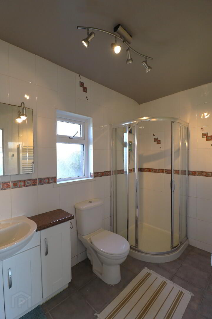 Rear aspect privacy window. Tiled floor and partly tiled walls. Corner shower enclosure. Vanity unit. Low flush w/c. chrome heated towel rail.
