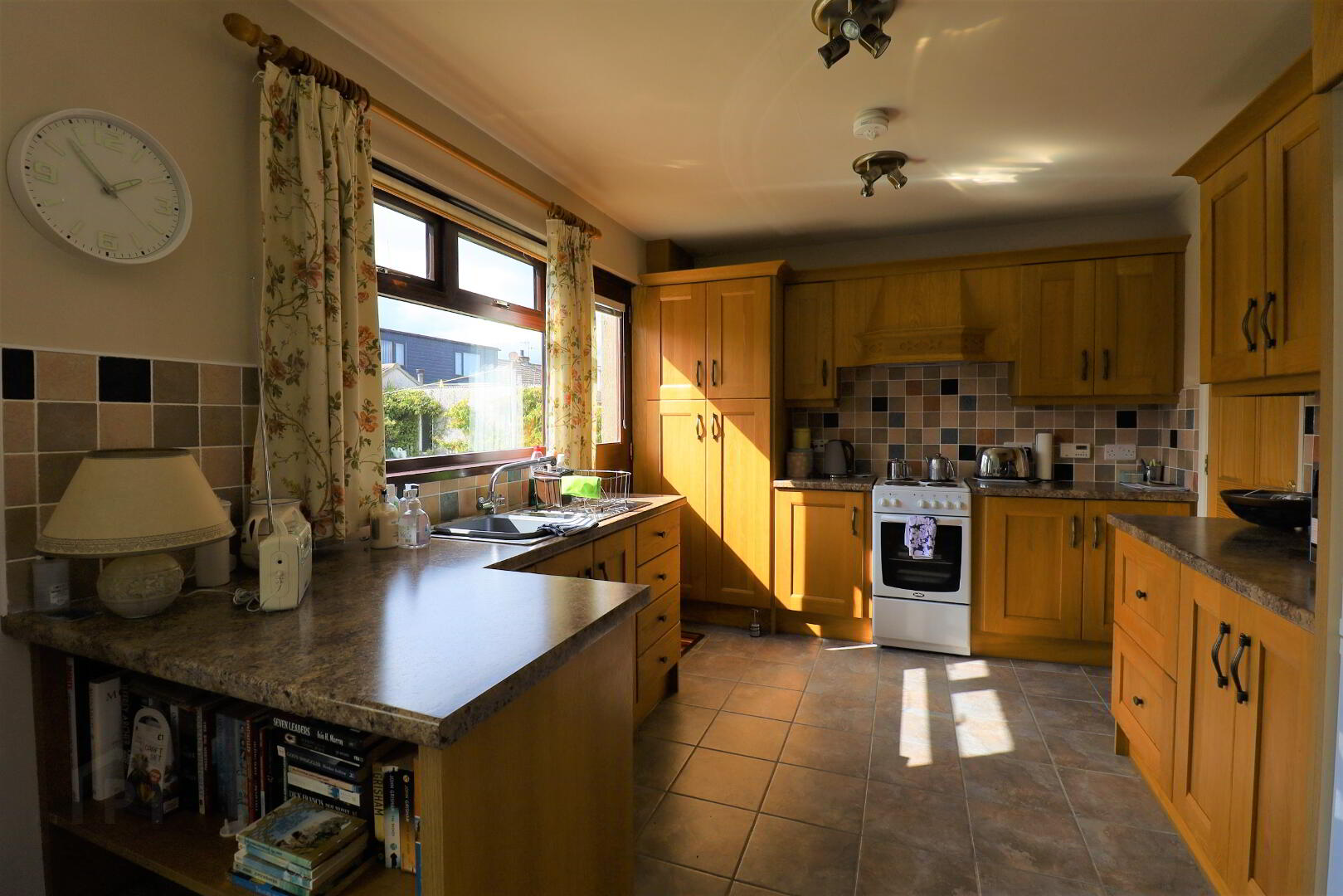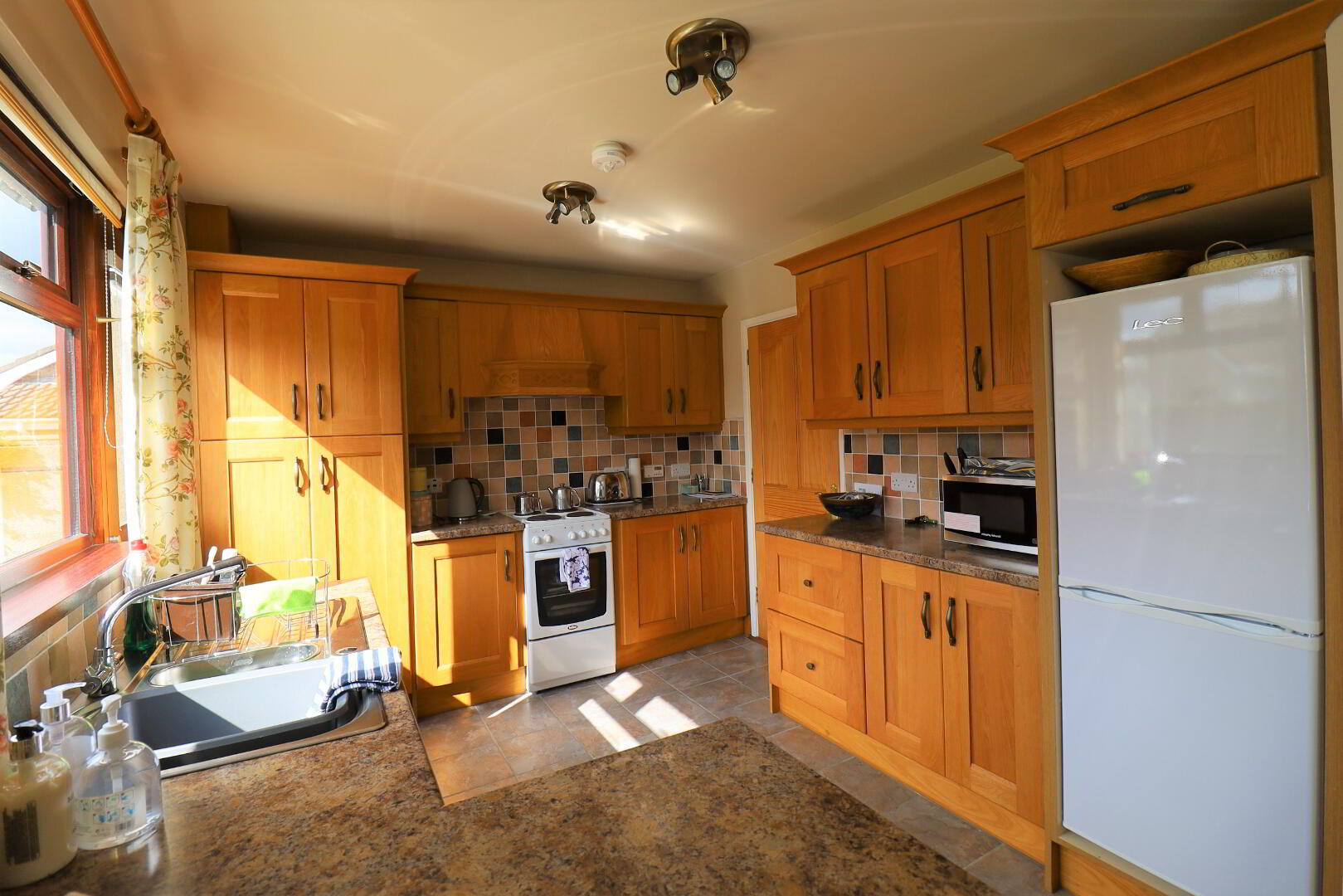 Solid fitted kitchen with a good range of high and low level units. Stainless steel sink and drainer. Electric cooker, provision left for a wider appliance. Free standing fridge/ freezer. Heating control. Spot lights. Tiled flooring and part walls. Two rear aspect windows.