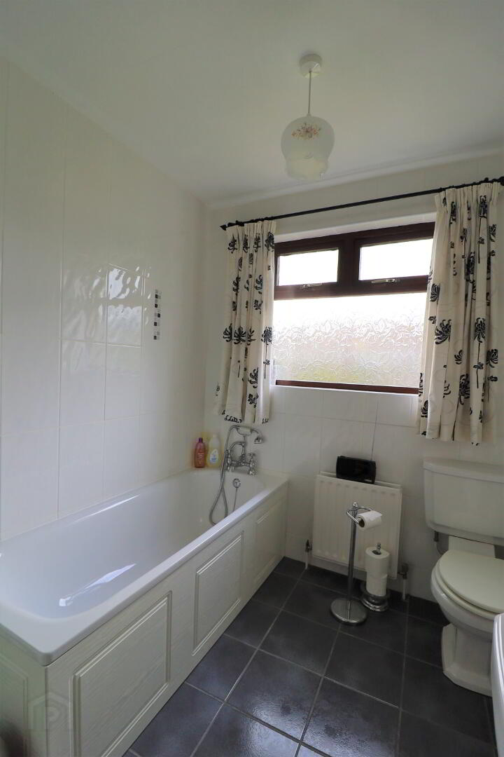 Fully tilled. Large electric corner shower. White suite comprising bath, hand wash basin and WC. Mirror cabinet above hand wash basin. Rear aspect window.