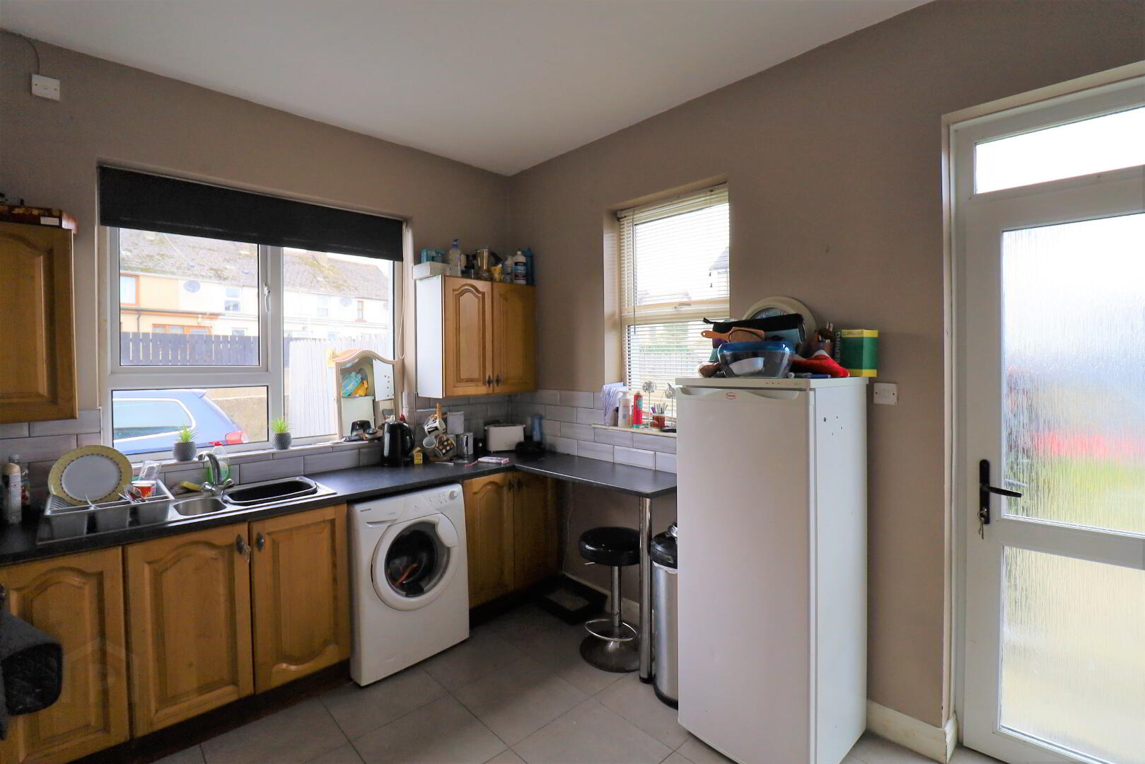 Rear and side aspect window. PVC door leading to rear of property. Tiled flooring and splashback. Fitted kitchen units. Electric oven and hob. Plumbed for washing machine. Timeclock for heating.